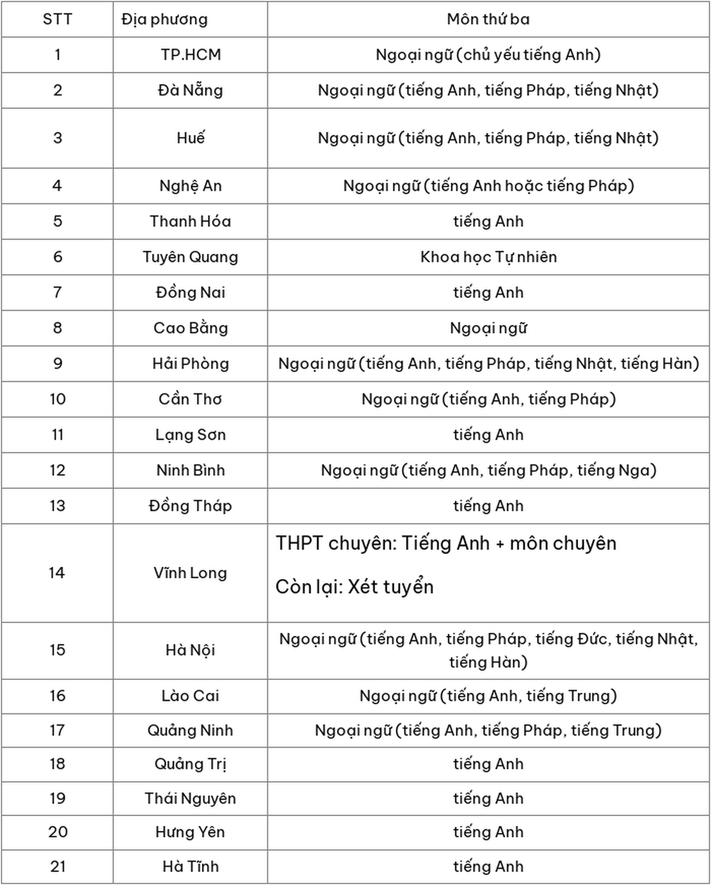 Tính đến ngày 14/2, tổng cộng 21/34 tỉnh, thành đã công bố phương án thi vào lớp 10, trong đó nêu rõ môn thi thứ ba. Phần lớn các địa phương tiếp tục chọn môn ngoại ngữ hoặc tiếng Anh là môn thi thứ ba. Tuyên Quang chọn môn khoa học tự nhiên. Riêng Vĩnh Long xét tuyển, nhưng thí sinh muốn thi vào trường chuyên vẫn phải làm bài thi ba môn Toán, Văn và Tiếng Anh.