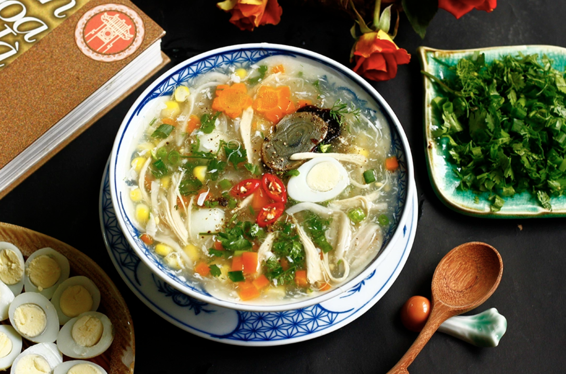 - Thịt gà, nấm hương, ngô ngọt, cà rốt, trứng gà, bột năng, gừng, hành, gia vị.
