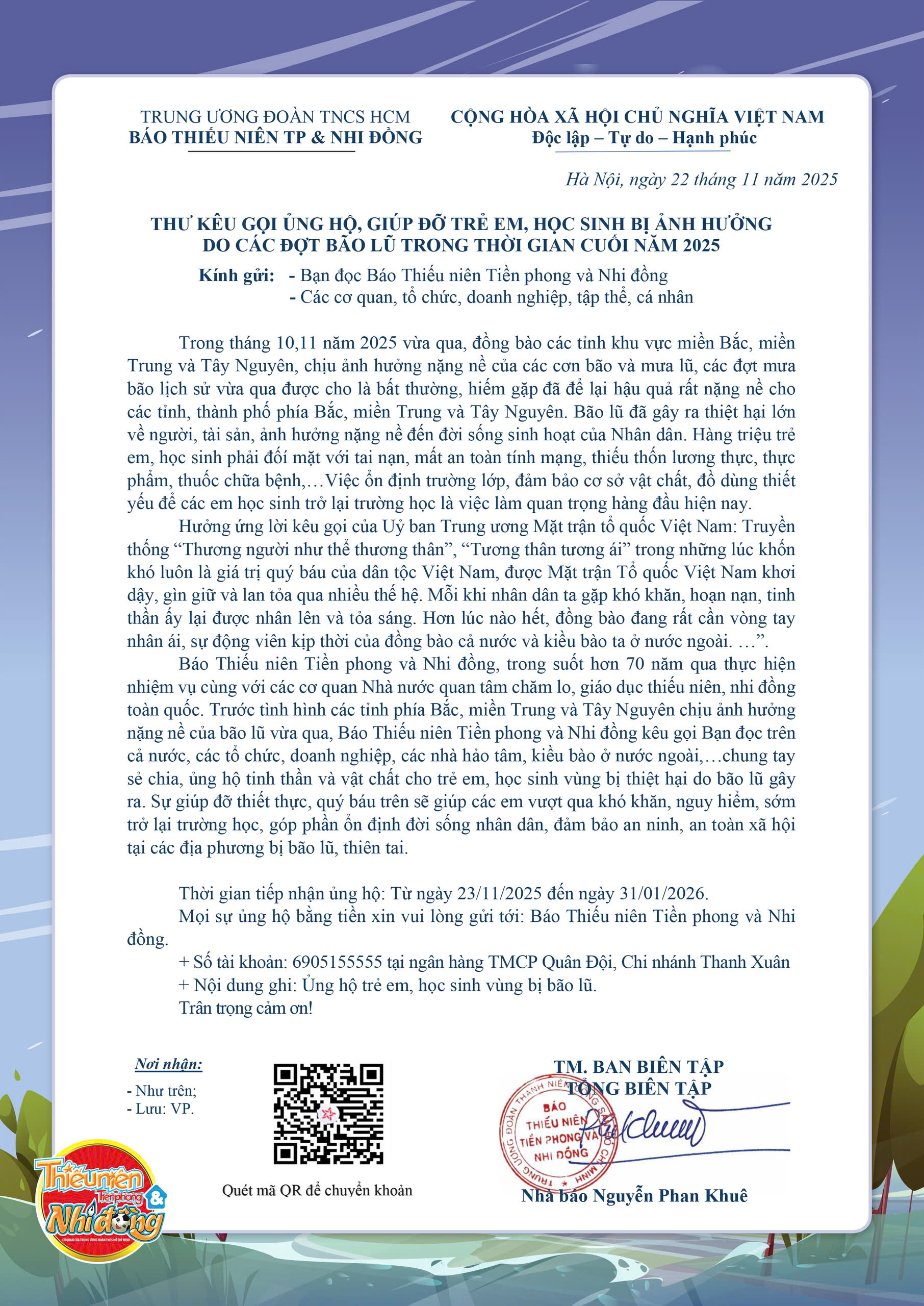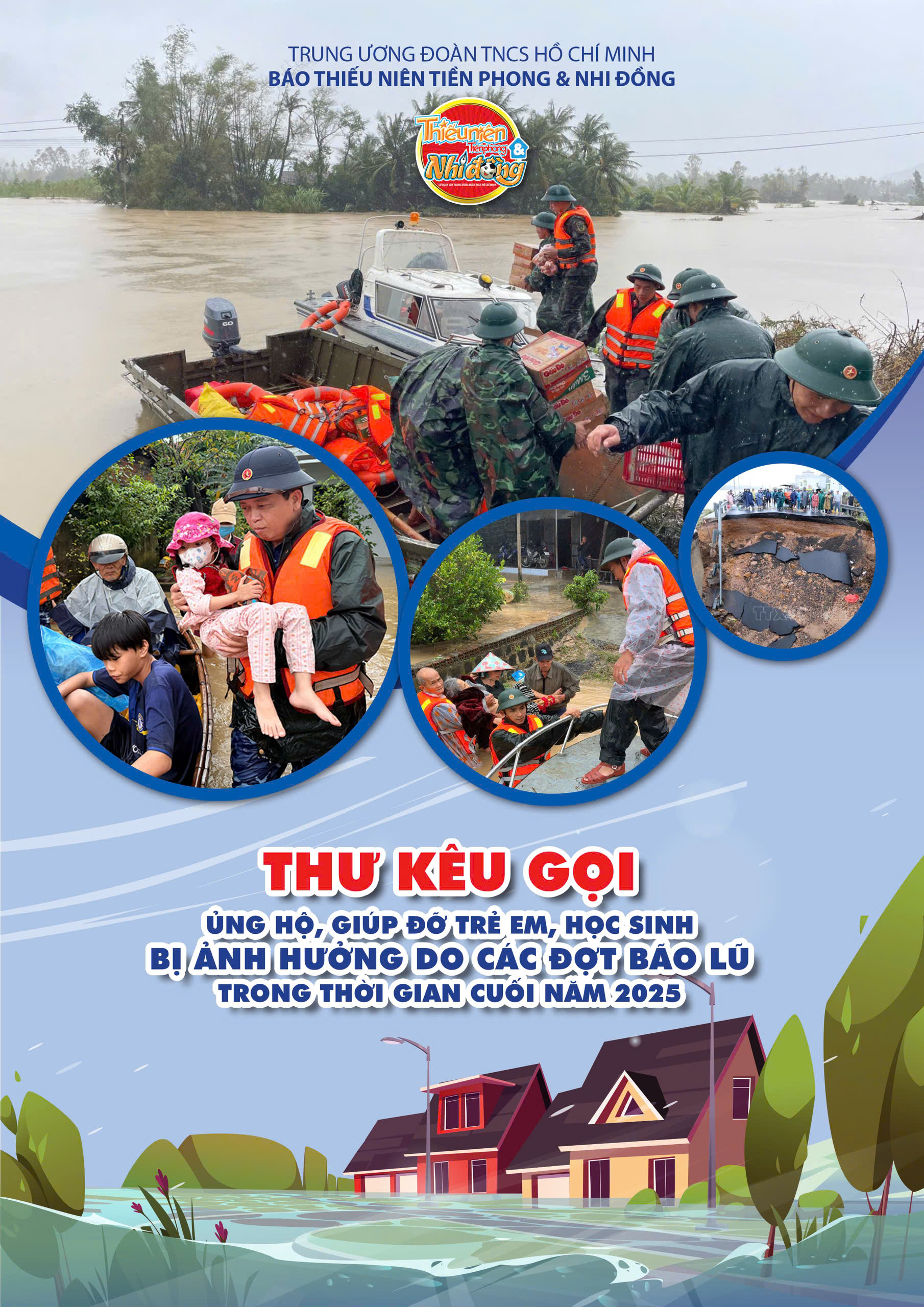 Những đợt bão lũ cuối năm 2025 đã gây thiệt hại nặng nề tại nhiều tỉnh phía Bắc, miền Trung và Tây Nguyên, khiến cuộc sống của hàng triệu người dân bị đảo lộn, đặc biệt là trẻ em và học sinh. Với tinh thần sẻ chia và trách nhiệm cộng đồng, Báo Thiếu niên Tiền phong và Nhi đồng trân trọng kêu gọi bạn đọc, các cơ quan, tổ chức, doanh nghiệp và cá nhân chung tay hỗ trợ để giúp các em vượt qua khó khăn, sớm ổn định học tập và cuộc sống.