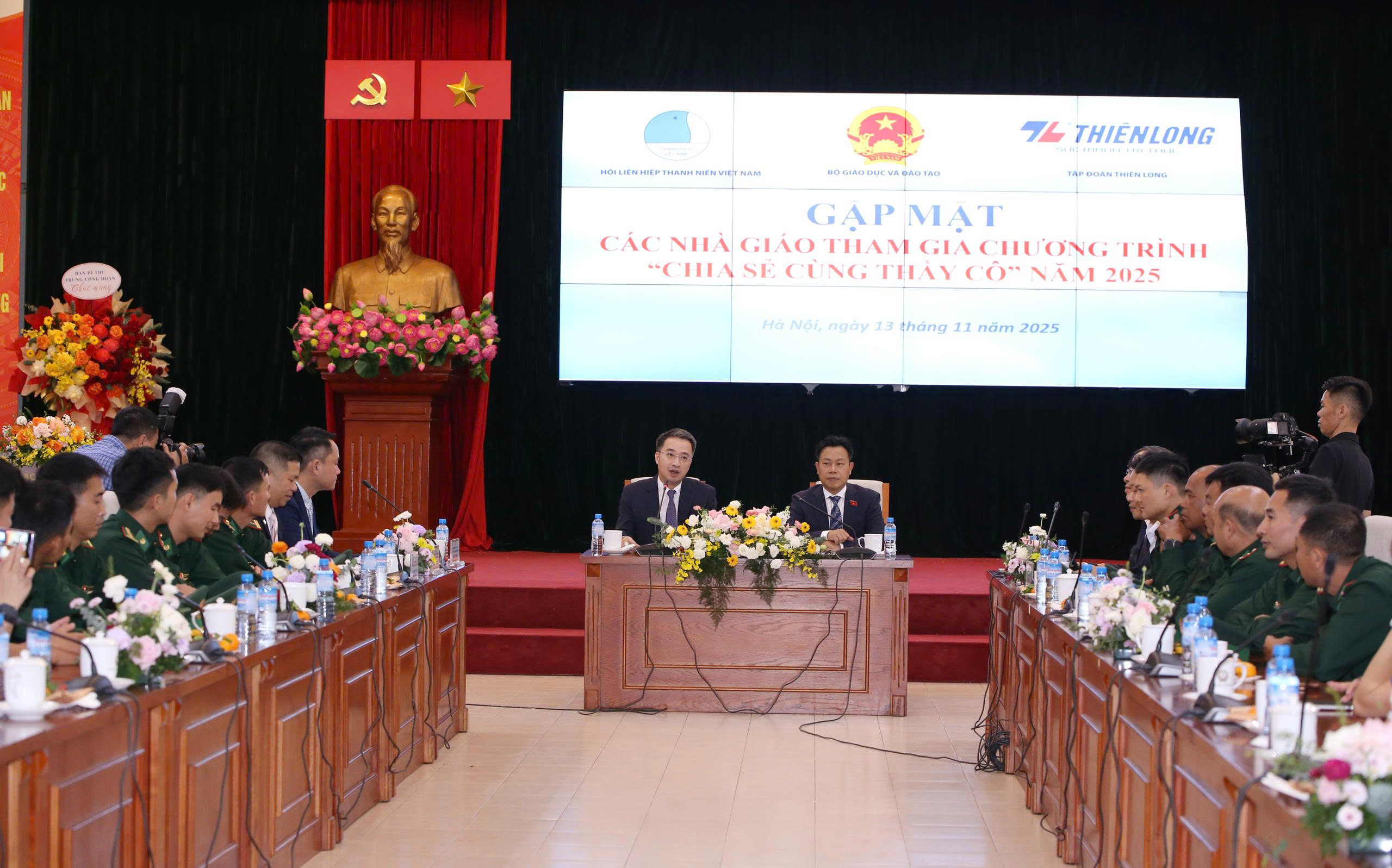 Chia sẻ tại buổi gặp mặt, anh Nguyễn Kim Quy cho biết chương trình “Chia sẻ cùng thầy cô” do Trung ương Hội LHTN Việt Nam phối hợp Bộ GD&ĐT và Tập đoàn Thiên Long tổ chức. Sau 10 năm, chương trình đã tuyên dương 576 giáo viên tiêu biểu trên cả nước: những thầy, cô “bám bản” ở vùng sâu, vùng xa, biên giới; thầy cô ở các huyện đảo; giáo viên đặc thù dạy trẻ khuyết tật; thầy cô là người dân tộc thiểu số và các cán bộ, chiến sĩ Bộ đội Biên phòng – những “thầy giáo quân hàm xanh”.