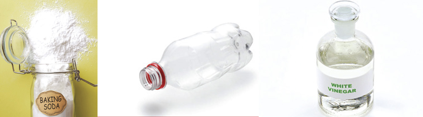 Bước 1: Đầu tiên, bạn đổ 1/3 chai giấm trắng vào chai nhựa, sau đó thêm 3 thìa nhỏ baking soda.