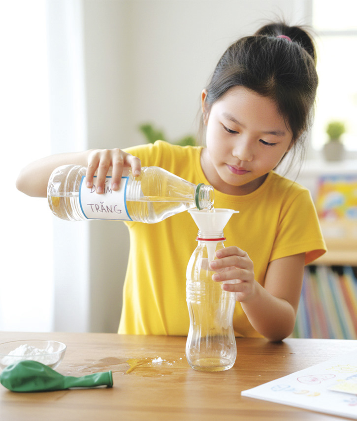 Bạn biết không, khi giấm kết hợp với baking soda sẽ tạo ra khí carbon dioxide. Khí này cố gắng thoát khỏi chai nhựa nên “chui” vào bóng bay và làm cho quả bóng bay phồng lên đấy. Giống như khi chúng mình thổi hay bơm bóng, cũng là cách để đẩy khí vào quả bóng bay làm nó phồng lên.