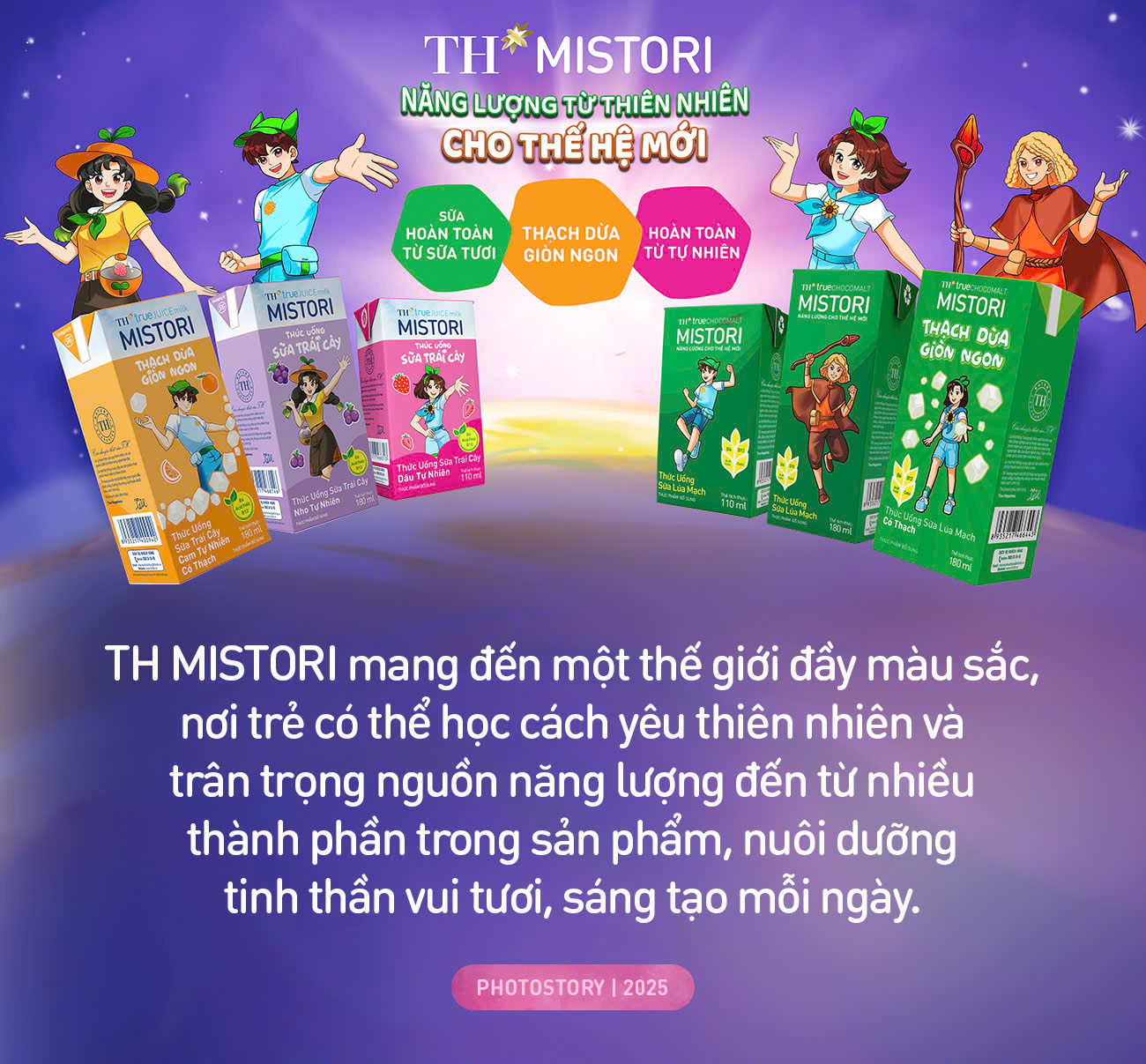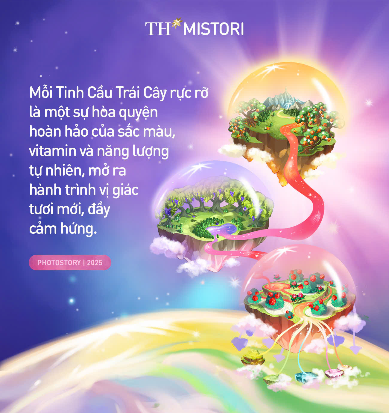 Trong thế giới đầy ắp niềm vui của các bạn nhỏ, mỗi chuyến khám phá trở nên trọn vẹn hơn khi có thêm nguồn tiếp sức thuần khiết, tươi mới. Thấu hiểu điều đó, Tập đoàn TH mang đến một trải nghiệm đầy hứng khởi - Vũ trụ TH MISTORI với Tinh Cầu Trái Cây rực rỡ sắc màu. Mỗi hộp TH MISTORI là một "phi thuyền năng lượng" đưa bé du ngoạn qua những hành tinh vị giác đầy thú vị: vị thơm ngậy của sữa tươi sạch TH, hòa quyện cùng sự tươi mát, sảng khoái của nước ép trái cây tự nhiên.
