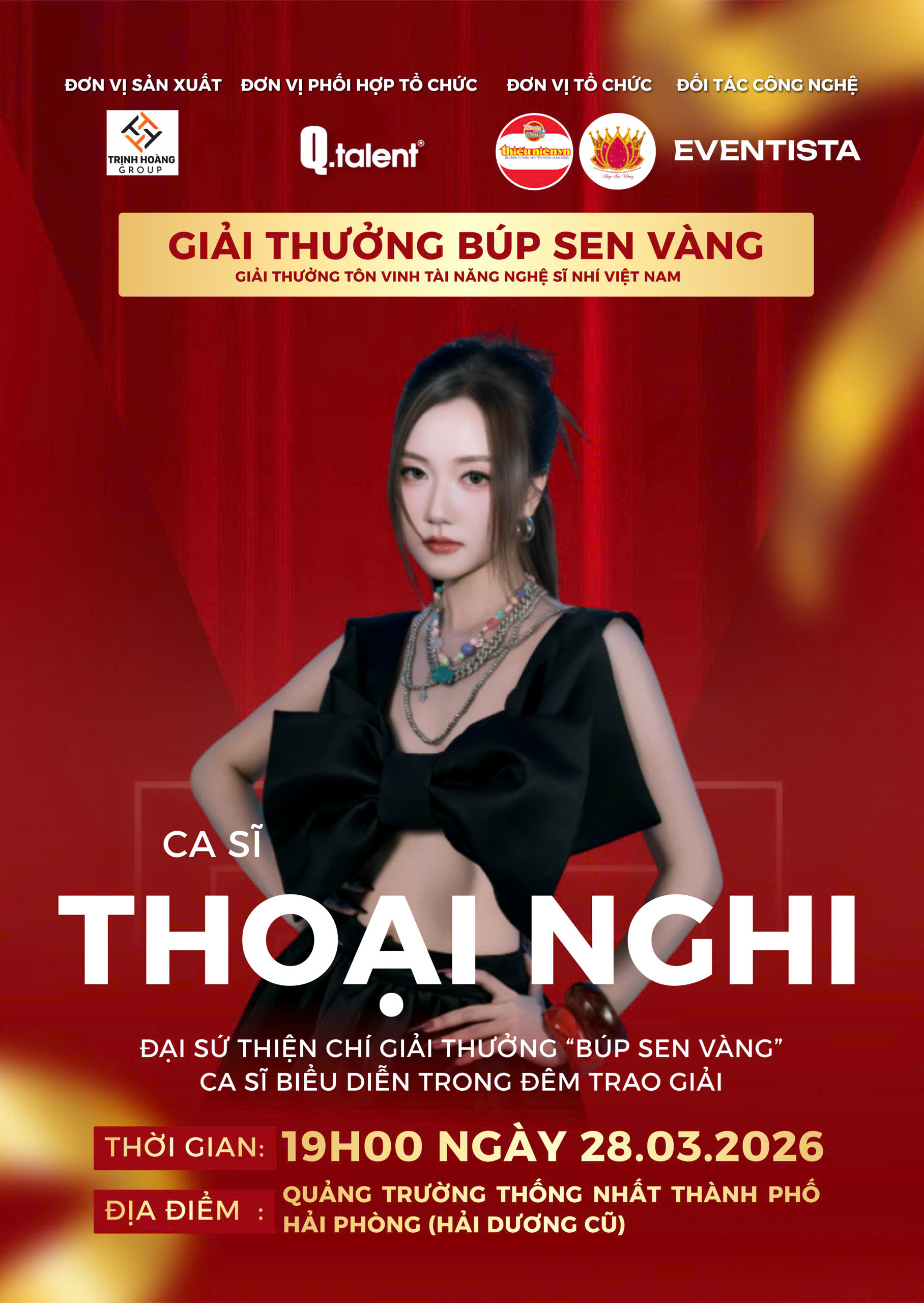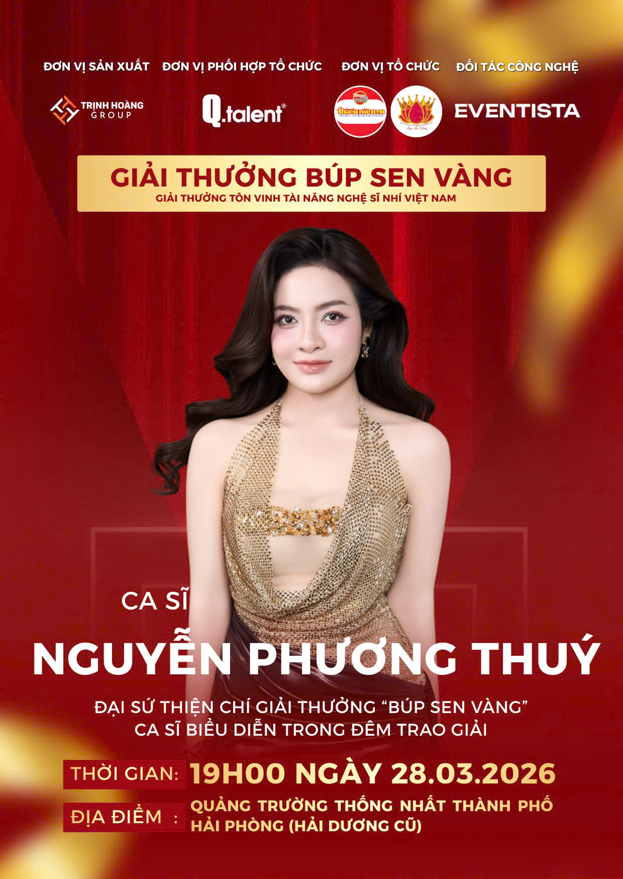 Đêm trao giải “Búp Sen Vàng” 2026 sẽ diễn ra vào lúc 19h00 ngày 28/03/2026 tại Quảng trường Thống Nhất, TP. Hải Phòng, hứa hẹn mang đến một bữa tiệc nghệ thuật trọn vẹn – nơi hội tụ tài năng, cảm xúc và lan tỏa những giá trị nhân văn sâu sắc. Với sự tham gia của khoảng 400 đại biểu, nghệ sĩ, thí sinh và khách mời, chương trình sẽ vinh danh các tài năng thiếu nhi tiêu biểu trên cả nước, đồng thời mang đến nhiều tiết mục nghệ thuật đặc sắc cùng hoạt động thiện nguyện ý nghĩa. |