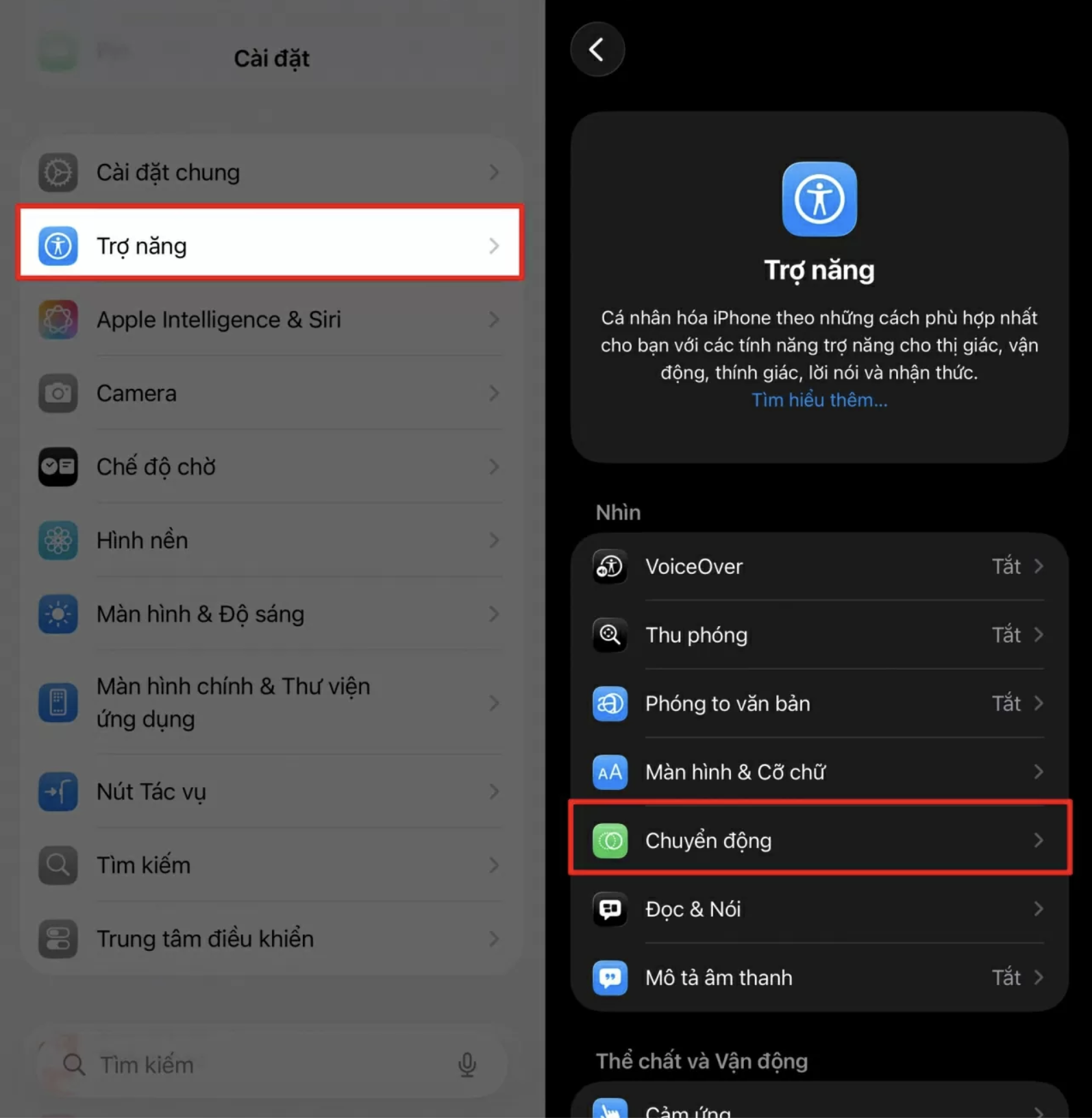 Bước 1: Vào ứng dụng Cài đặt trên iPhone > Chọn mục Trợ năng > Nhấn vào Chuyển động.