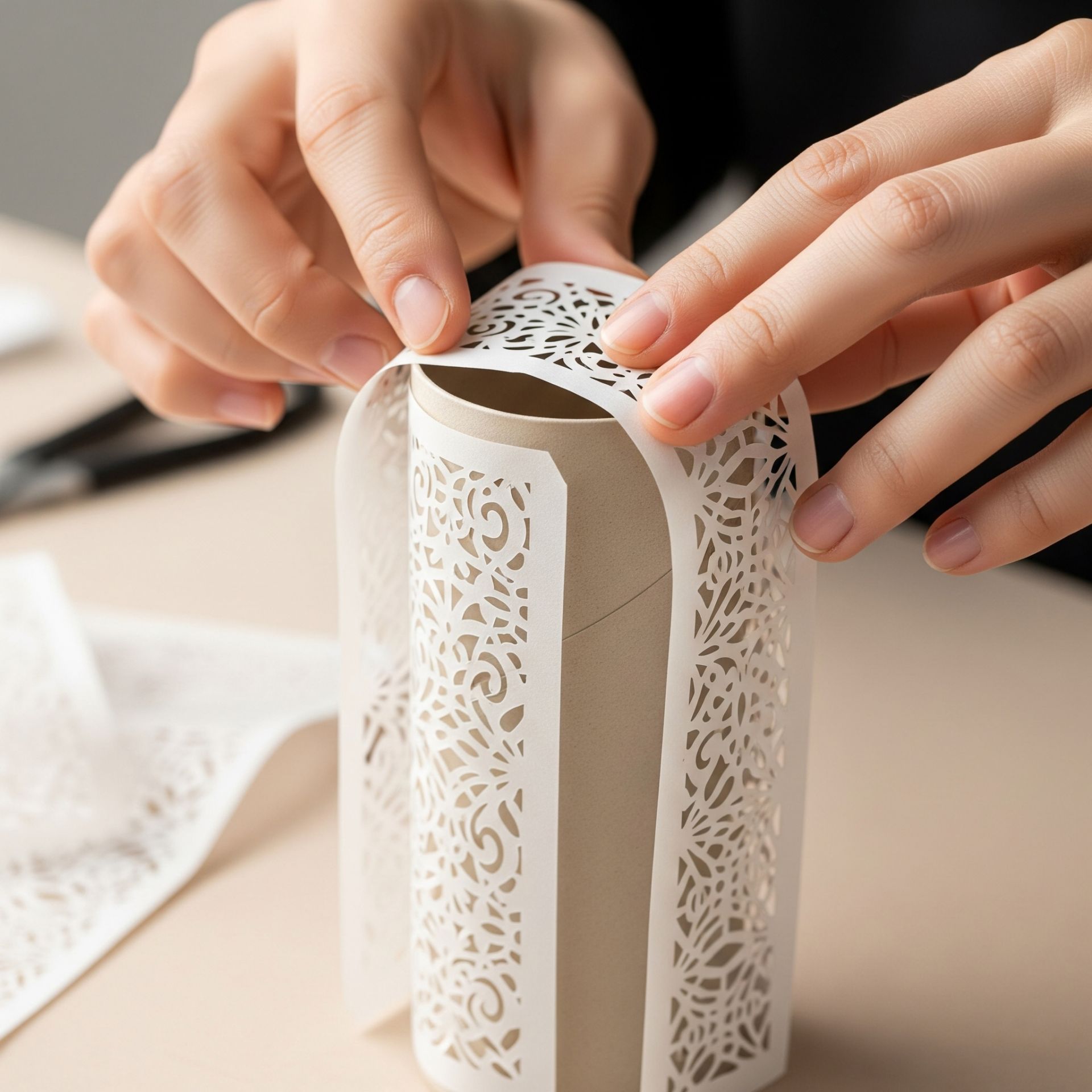 Sau đó, lấy mảnh giấy vừa cắt dán quanh phần đầu và cuối của ống trụ. Độ dài chênh lệch giữa hai mảnh giấy sẽ tạo nên hiệu ứng phồng cho thân đèn lồng đặc trưng của kiểu lồng đèn truyền thống.