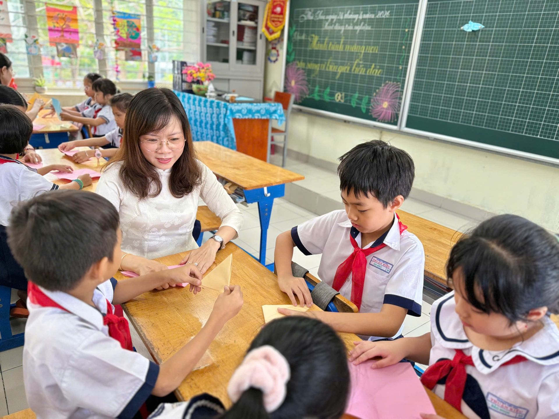 Đặc biệt, cô Lê Thị Thoa, Bí thư Chi bộ, Hiệu trưởng nhà trường đã trực tiếp cùng các em học sinh ngồi gấp từng cánh hạc. Hình ảnh giản dị ấy góp phần lan tỏa tinh thần sẻ chia trong toàn trường. Những cánh hạc nhỏ xíu nhưng mang theo ước mơ lớn: ước mơ về hòa bình, về sự gắn kết và về một Việt Nam luôn đoàn kết, yêu thương nhau dù ở bất cứ nơi đâu.
