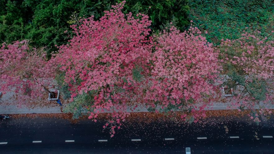 Theo ghi nhận, đoạn đường có hoa kèn hồng nở rộ kéo dài gần 1km. Khi hoa bung nở, từng chùm hoa lớn phủ kín cành, nhiều cánh hoa rơi xuống mặt đường tạo nên tấm thảm màu hồng nhạt, khiến khung cảnh càng thêm nên thơ.