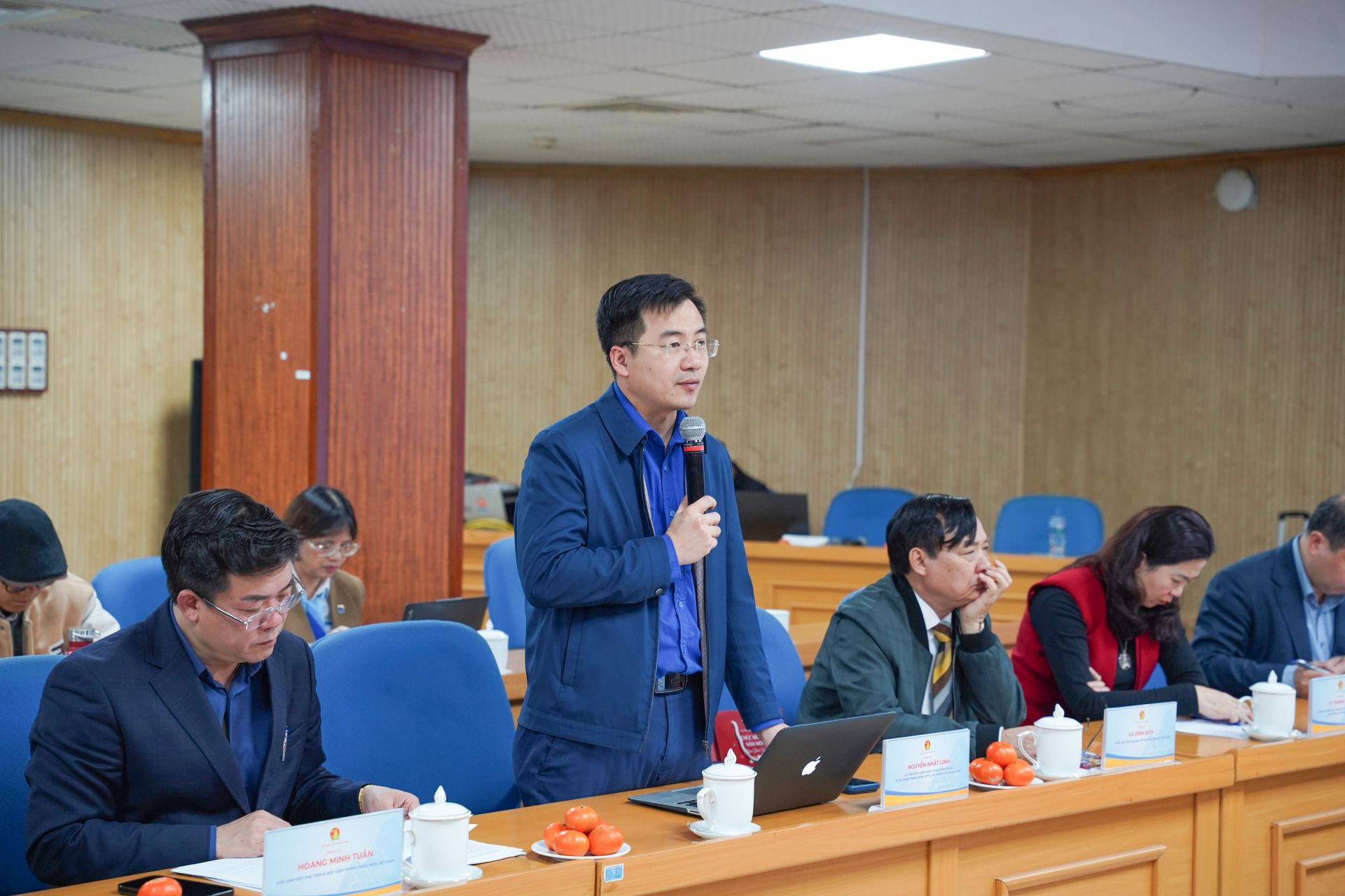 Chủ trì hội nghị có chị Nguyễn Phạm Duy Trang - Bí thư T.Ư Đoàn, Chủ tịch Hội đồng Đội T.Ư; anh Lê Hải Long - Ủy viên Ban thường vụ T.Ư Đoàn, Phó Chủ tịch thường trực Hội đồng Đội T.Ư; cô Nguyễn Thị Mai Thoa - Ủy viên thường trực Ủy ban Văn hóa Giáo dục của Quốc hội, Phó Chủ tịch Hội đồng Đội T.Ư.