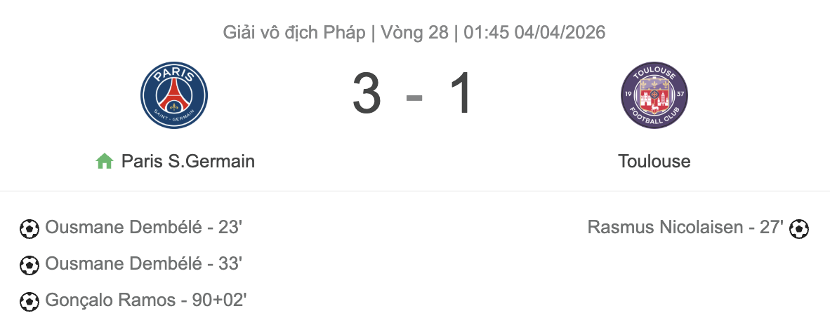 Những điều chỉnh nhân sự ở cuối trận giúp PSG duy trì thế chủ động. Phút bù giờ, Gonçalo Ramos ấn định chiến thắng 3-1 bằng pha dứt điểm gọn gàng.