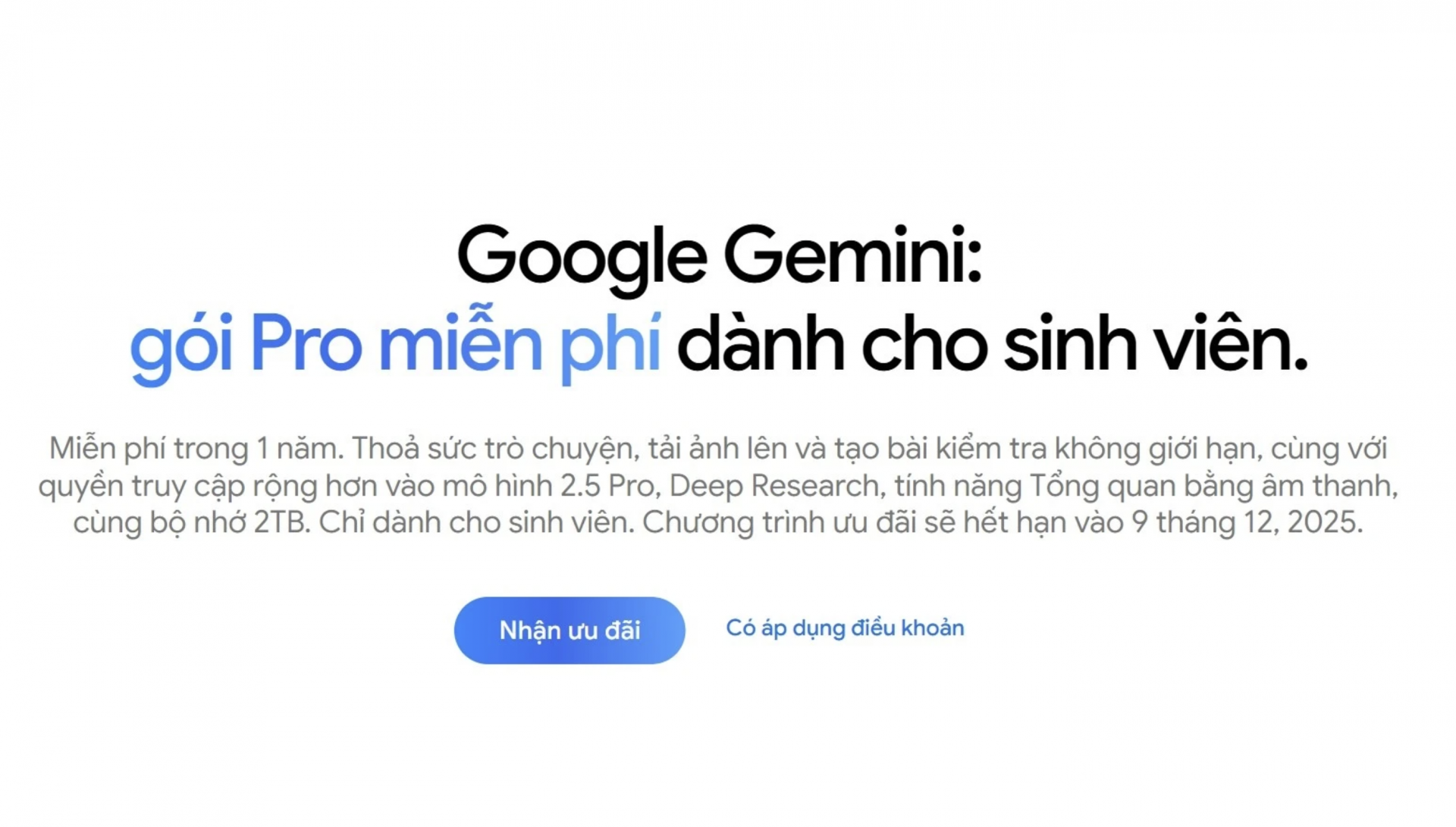 Google vừa triển khai chương trình Gemini for Students tại Việt Nam, cho phép sinh viên sử dụng gói AI Pro trị giá 489.000 đồng/tháng hoàn toàn miễn phí trong 12 tháng. Tổng giá trị ưu đãi lên đến gần 6 triệu đồng cho mỗi sinh viên.