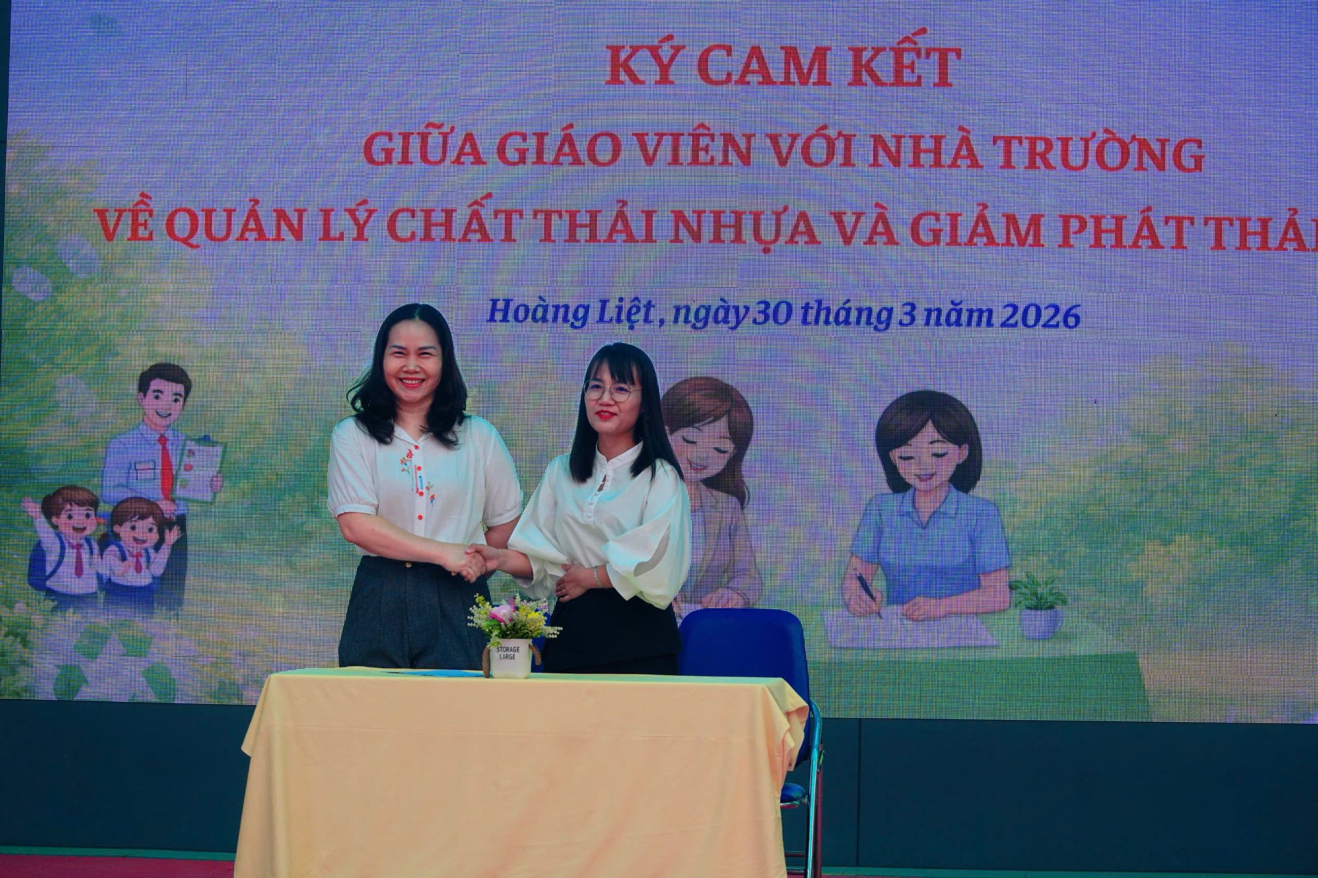 Không dừng lại ở lời kêu gọi, chương trình còn ghi dấu bằng nghi thức ký cam kết trang trọng giữa giáo viên với nhà trường, giữa học sinh với Liên đội. Những chữ ký đặt xuống là một lời hứa về sự thay đổi, về trách nhiệm với môi trường sống xung quanh.
