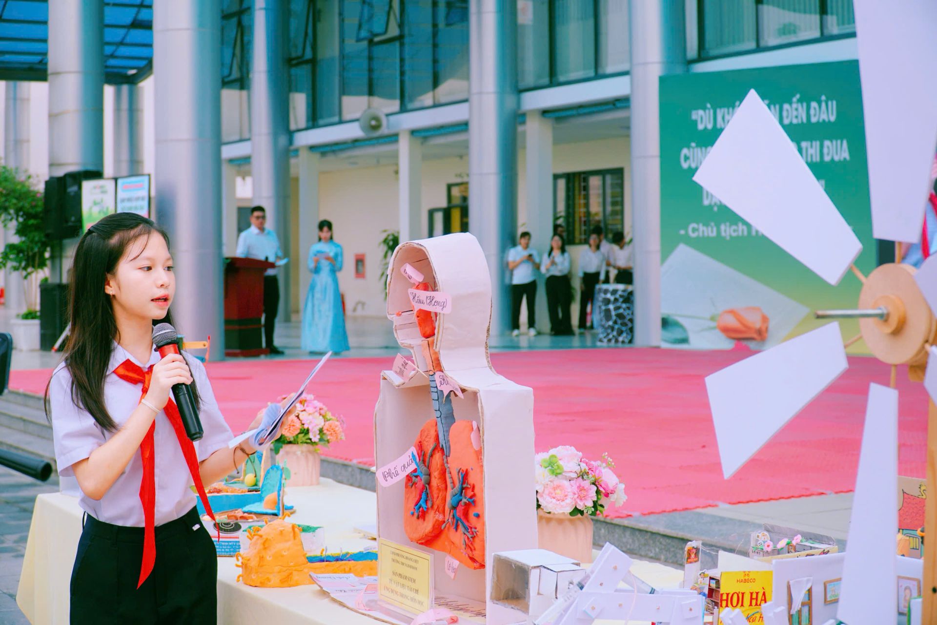 Nhà trường đã tổ chức khu trưng bày và thuyết trình các sản phẩm STEM từ vật liệu tái chế. Từ những chai nhựa, bìa carton hay các vật dụng đã qua sử dụng, các bạn học sinh khối 6 đã “hô biến” thành những mô hình sống động: “Ngôi trường ước mơ” xanh mát, “Khu vui chơi tái chế” đầy sắc màu hay những sản phẩm ứng dụng trong học tập.