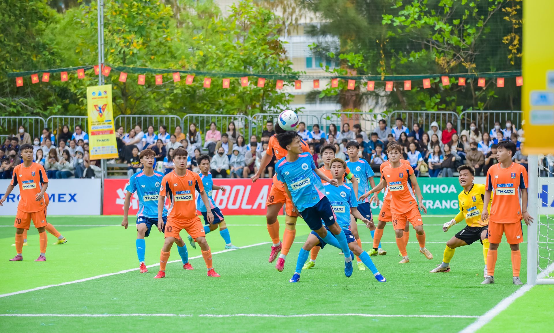 Ngay sau lễ khai mạc, trận đấu đáng chú ý giữa đội chủ nhà Trường ĐH Nha Trang và CĐ FPT Polytechnic đã diễn ra trong bầu không khí cổ vũ sôi động của đông đảo sinh viên trên khán đài.
