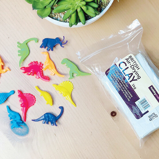 Khủng long đồ chơi với nhiều hình dáng khác nhau, đất sét, dao nhựa cắt đất sét…