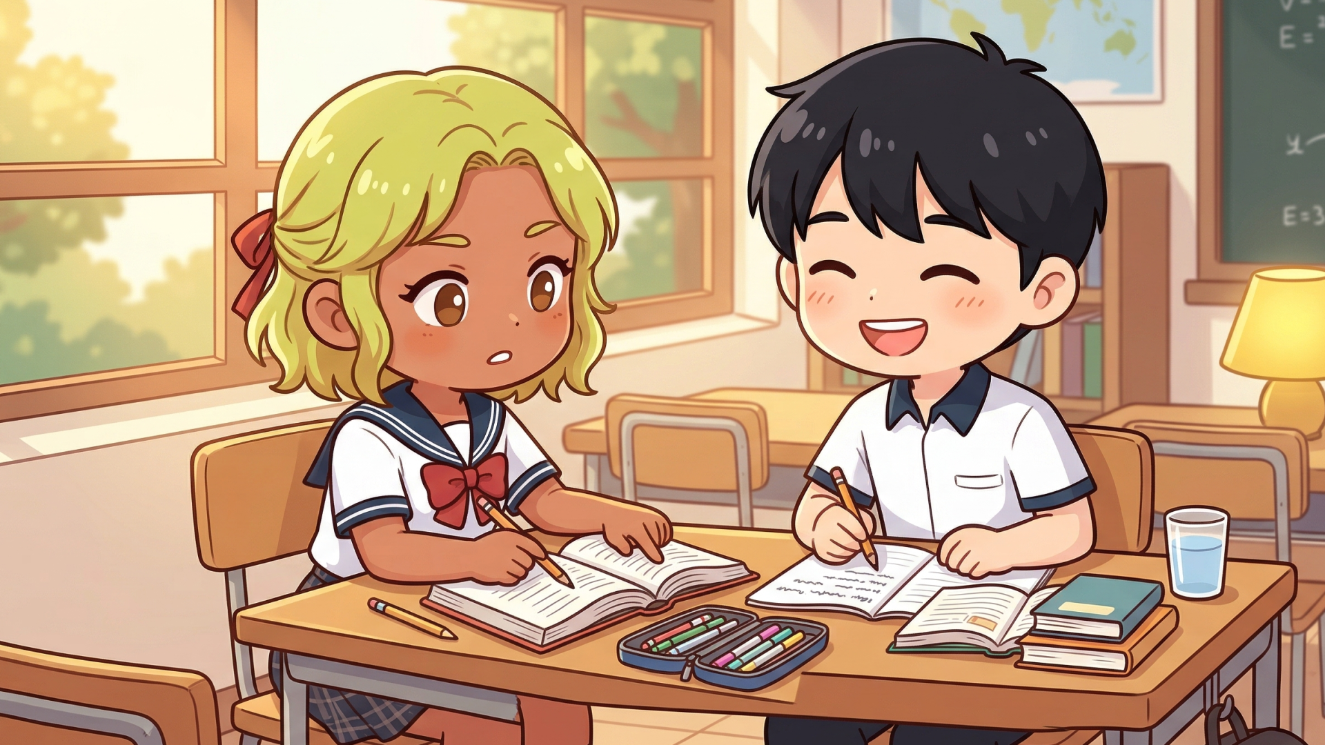 Cái bàn rộng thênh thang giờ bị chia cắt bởi vạch phấn trắng. Tôi – một đứa cá biệt, hầu như giờ chào cờ nào cũng bị nêu gương. Còn nó, theo lời cô thì: “Nhà Nguyệt hoàn cảnh khó khăn nhưng học rất giỏi và lại ngoan. Cô hy vọng bạn ấy sẽ giúp Minh phấn đấu cải thiện học tập và hạnh kiểm!”