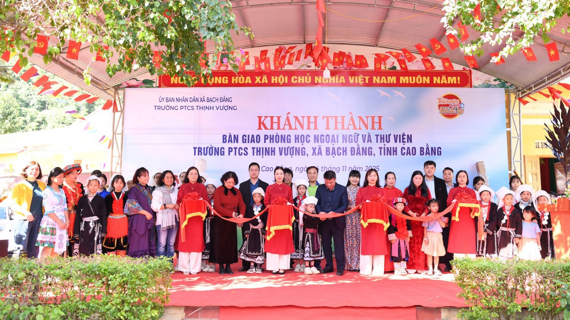 Phòng học tiếng Anh khang trang cùng thư viện với hàng nghìn đầu sách là món quà ý nghĩa mà Báo Thiếu niên Tiền phong và Nhi đồng cùng các đơn vị, cá nhân hảo tâm gửi tặng trường PTCS Thịnh Vượng (xã Bạch Đằng, tỉnh Cao Bằng), sau thiệt hại nặng nề do bão Yagi năm 2024.