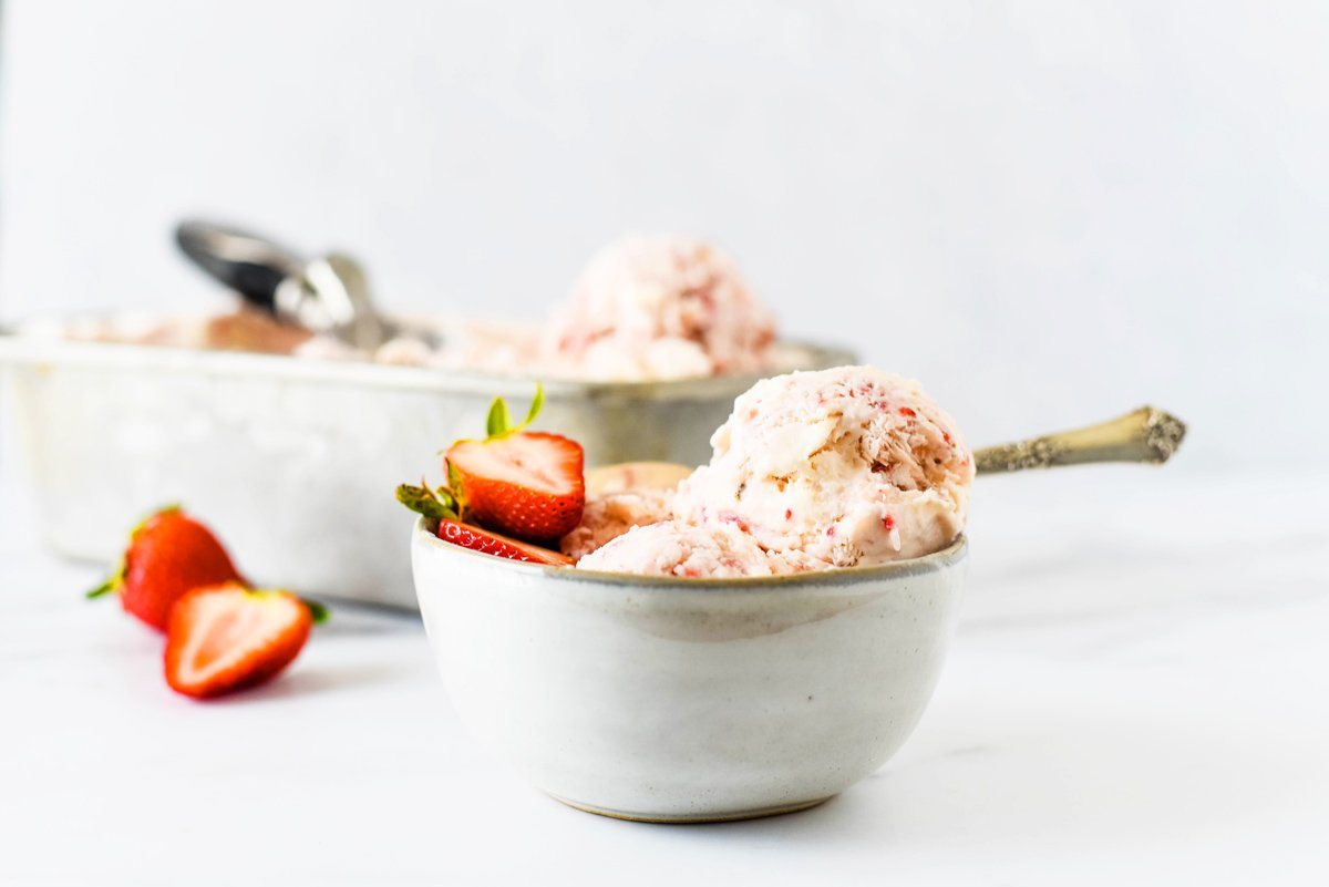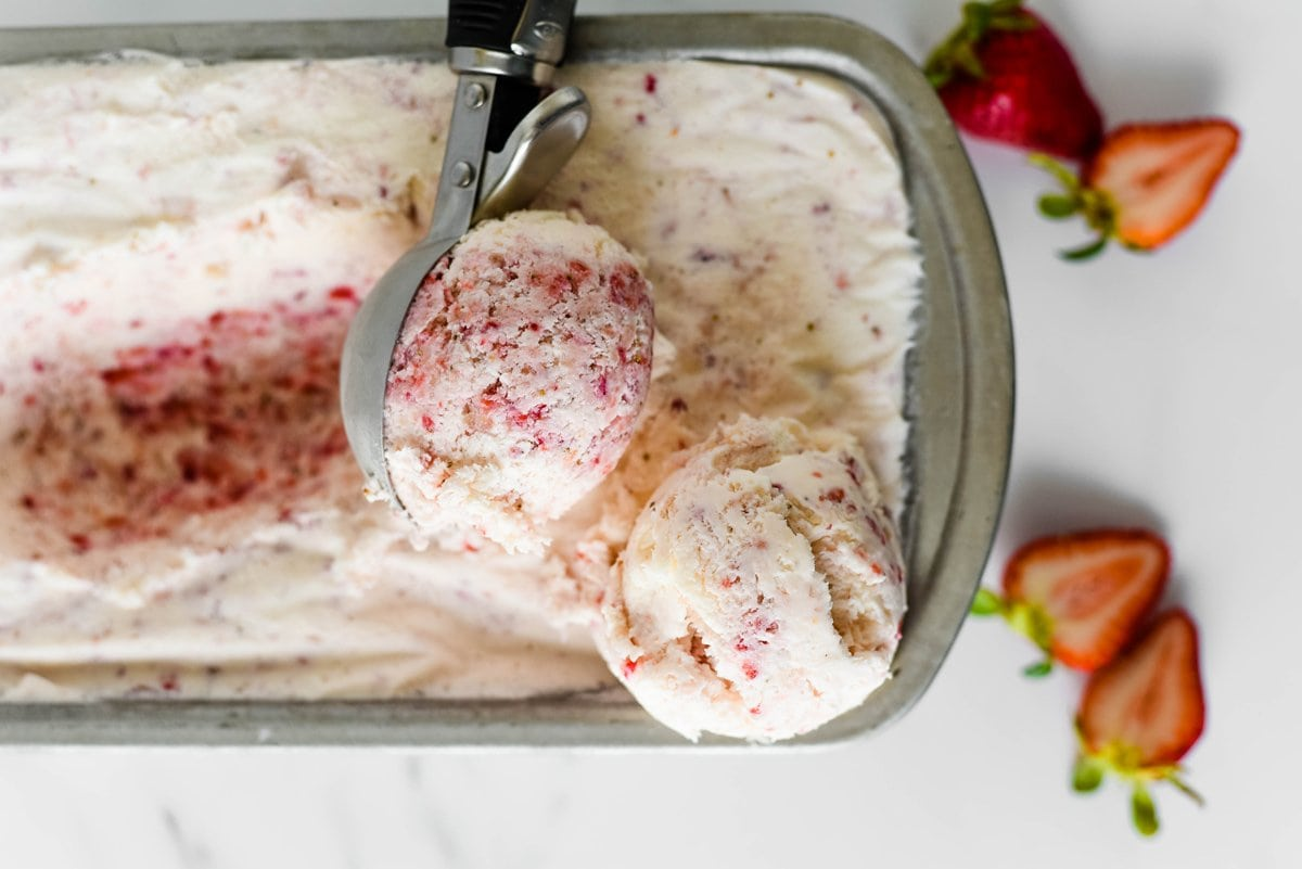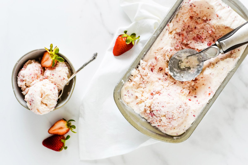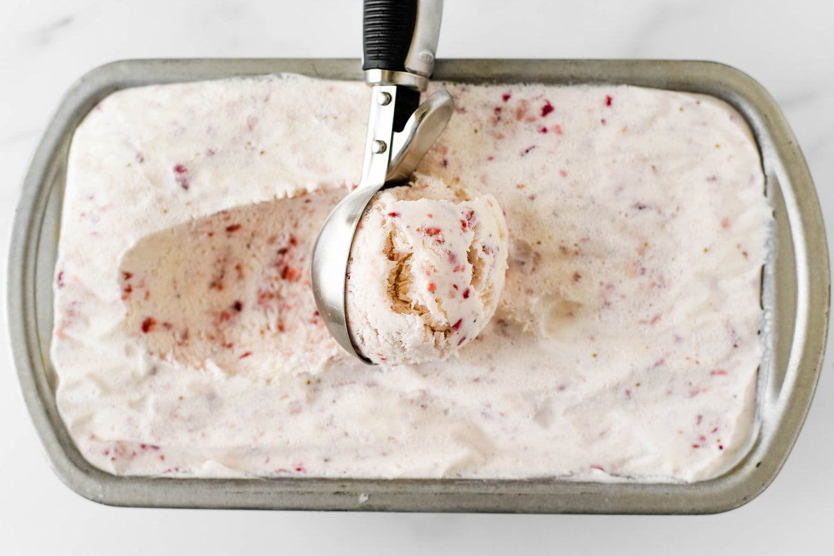 Bước 6: Cho kem vào tủ đá khoảng 2 tiếng để kem đông lại. Khi ăn, lấy kem ra ngoài khoảng 10 phút cho mềm ra là có thể múc kem thưởng thức liền!