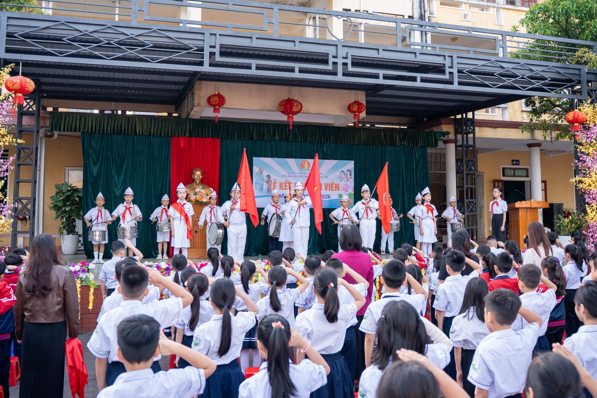 Trong khoảnh khắc trang trọng của buổi lễ, Ban giám hiệu nhà trường cùng các thầy cô giáo và các Đội viên lớn đã tiến hành trao khăn quàng đỏ cho các Đội viên mới. Từ giây phút này, các em chính thức được đứng vào hàng ngũ của Đội Thiếu niên Tiền phong Hồ Chí Minh, đánh dấu bước trưởng thành quan trọng trong quá trình học tập và rèn luyện.