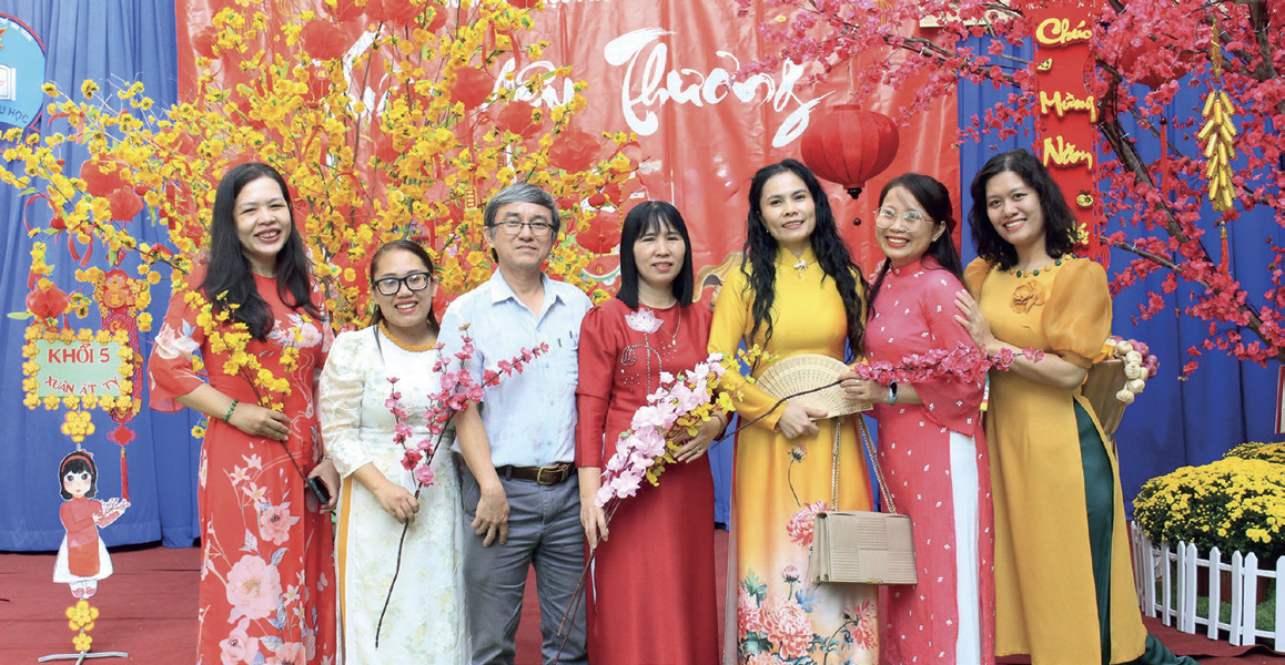 Những ngày gần Tết, sân trường như được khoác lên chiếc áo mới rực rỡ của mùa Xuân: Sắc vàng của mai, hồng thắm của đào và những góc trang trí xinh xắn do chính tay các bạn học sinh chăm chút.