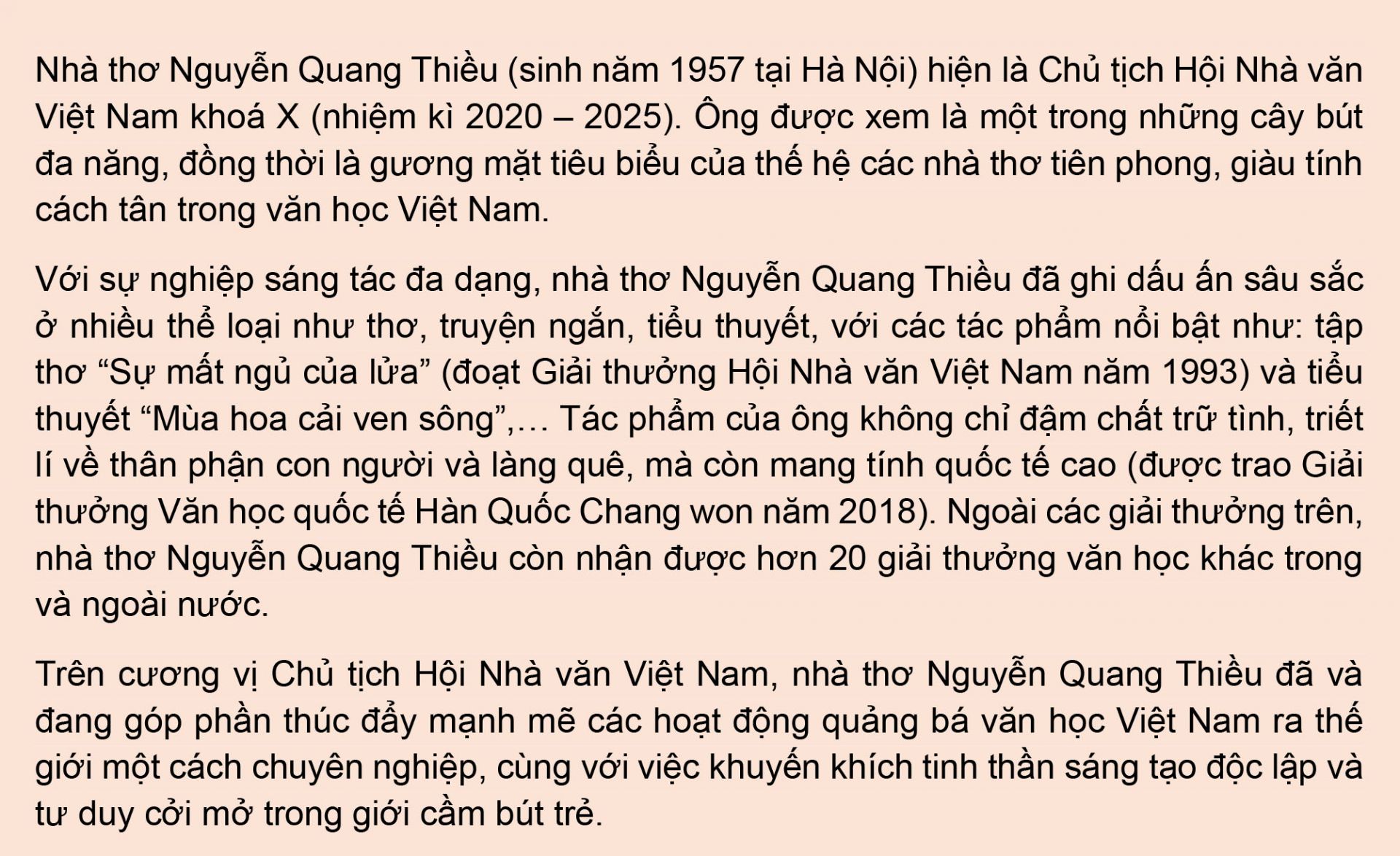 Với kinh nghiệm sáng tác, nghiên cứu văn học và nhiều năm hoạt động trong lĩnh vực phát triển văn hoá đọc, nhà thơ Nguyễn Quang Thiều sẽ mang đến những góc nhìn mới mẻ và thực tế, giúp phụ huynh ý thức rõ vai trò của mình trong việc đồng hành với con qua các trang sách.