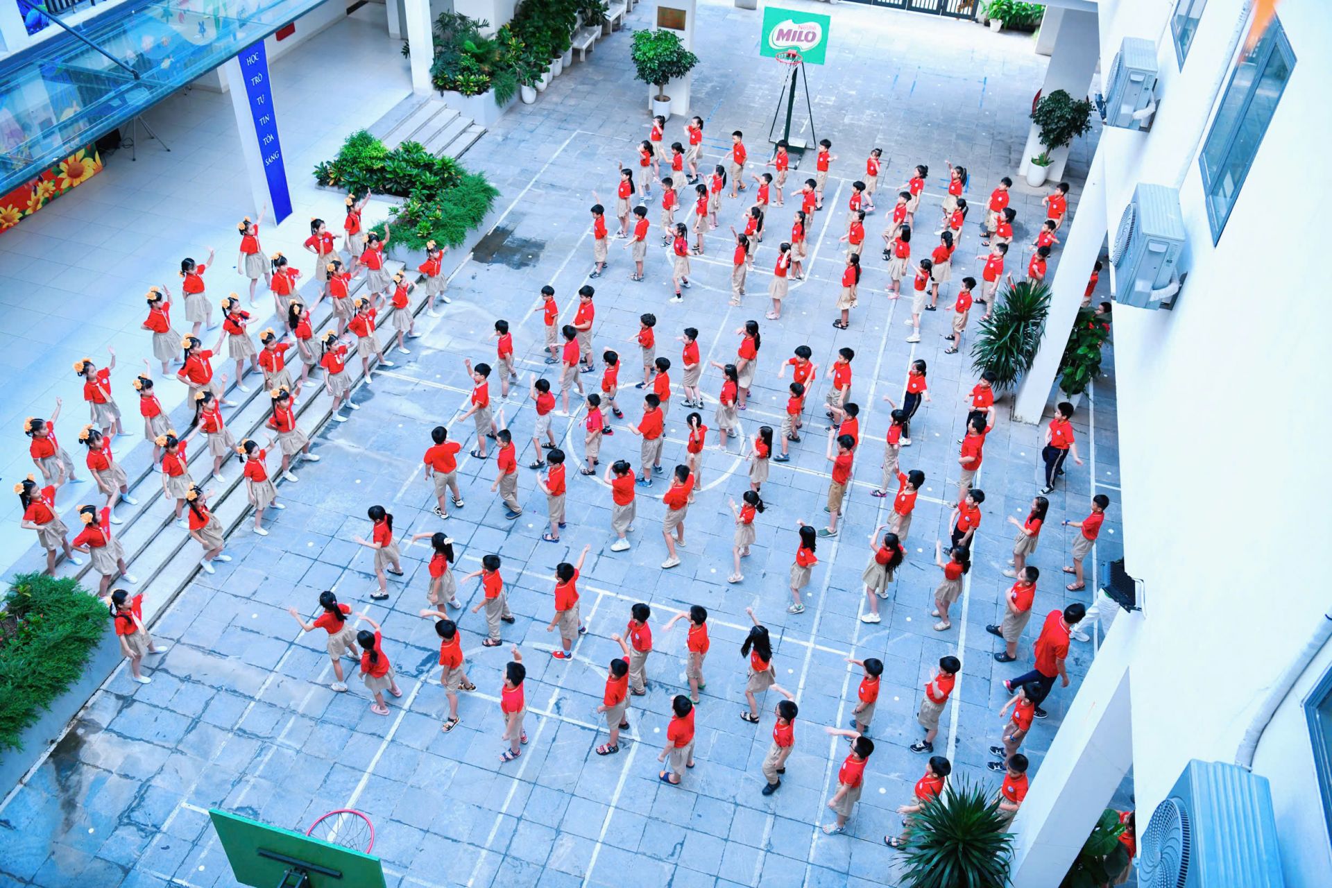 Dưới nắng thu trong trẻo, sân trường Quang Trung rực rỡ sắc đỏ của màu áo đồng phục. Các em học sinh khối 3 say mê hòa mình trong điệu nhảy trẻ trung, đầy năng lượng. Đội hình biểu diễn nổi bật với những gương mặt rạng rỡ, ánh mắt tự tin và nụ cười hồn nhiên.