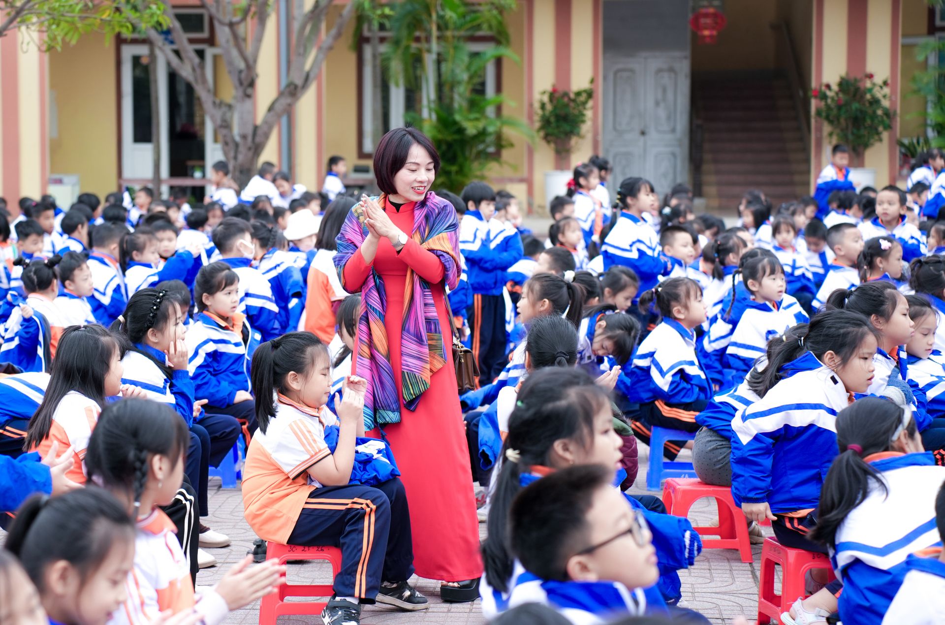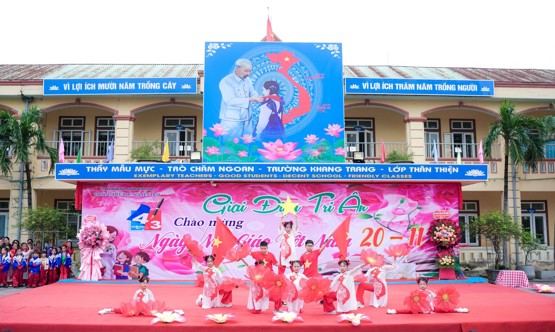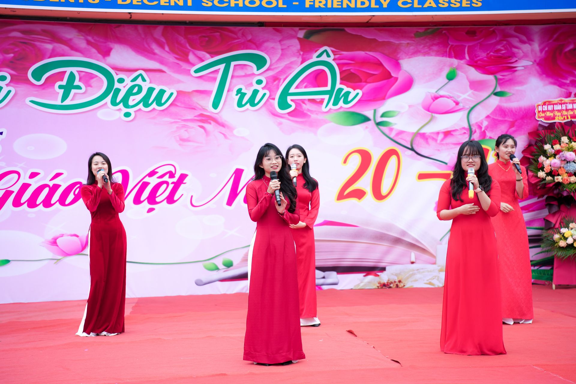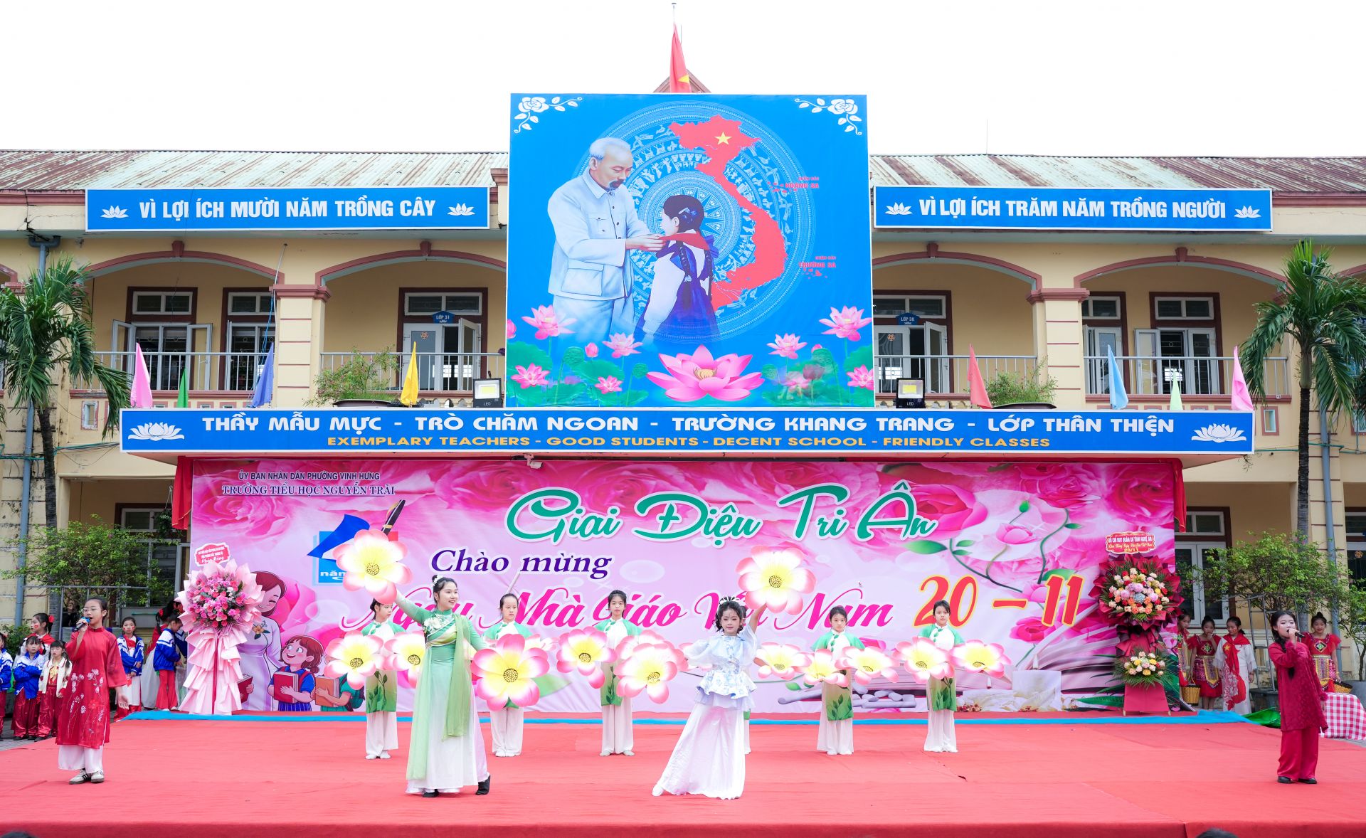 Ngay từ buổi sáng, sân trường đã rộn ràng trong sắc hoa và tiếng cười trẻ thơ. Các tiết mục văn nghệ được chuẩn bị công phu, từ trang phục, âm nhạc cho đến hình thức thể hiện, thể hiện sự nỗ lực và tấm lòng của các em học sinh dành tặng thầy cô.