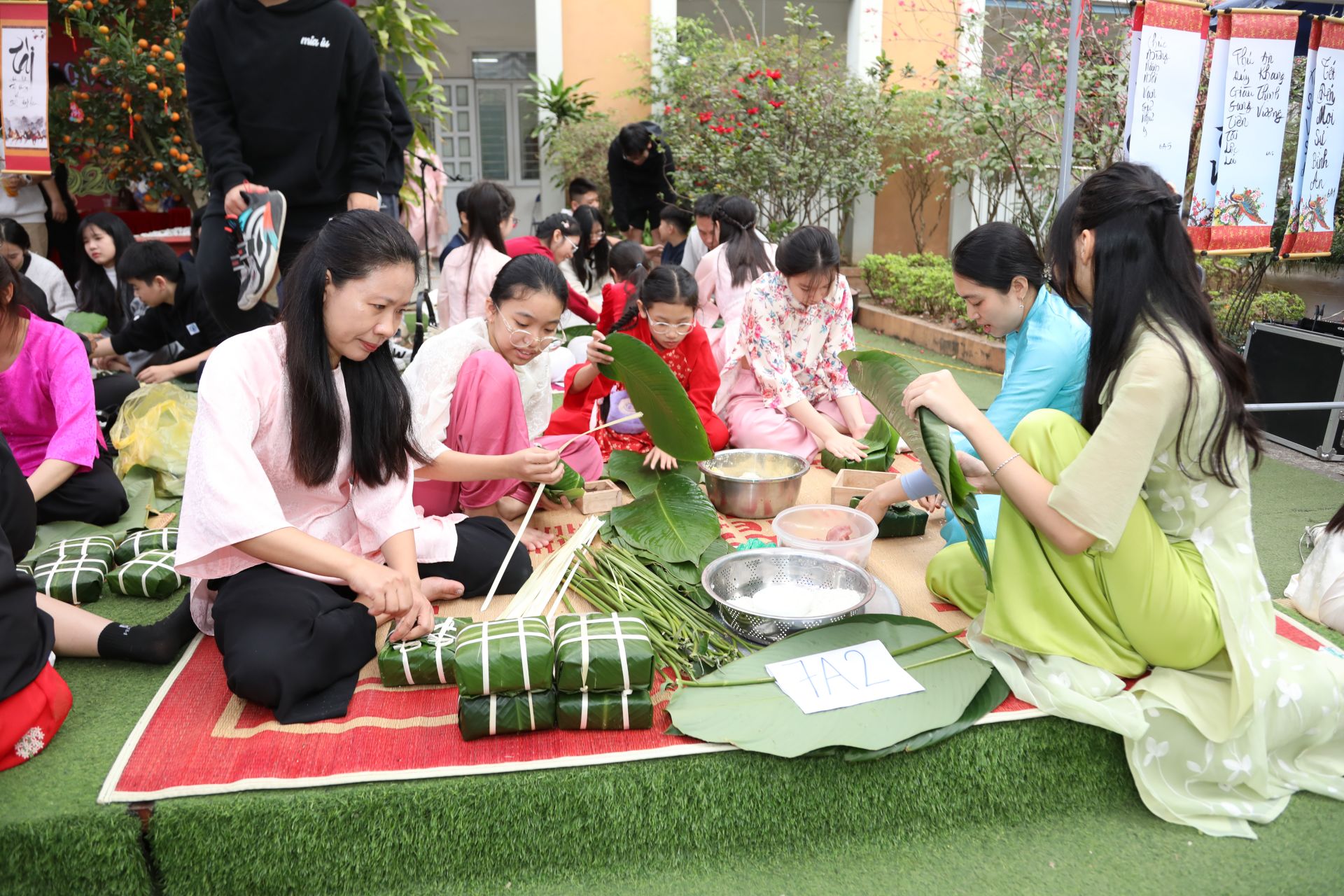 Một trong những trải nghiệm ý nghĩa nhất là phần thi gói bánh chưng. Trong 30 phút, các lớp cùng phụ huynh phối hợp hoàn thành những chiếc bánh vuông vắn, xanh màu lá dong. Hoạt động giúp học sinh hiểu rõ hơn về nguồn gốc, ý nghĩa của bánh chưng trong ngày Tết, đồng thời cảm nhận được sự gắn kết gia đình và tinh thần cộng đồng. Những đôi tay còn vụng về nhưng ánh mắt háo hức đã tạo nên hình ảnh đẹp về một thế hệ trẻ biết trân trọng truyền thống.