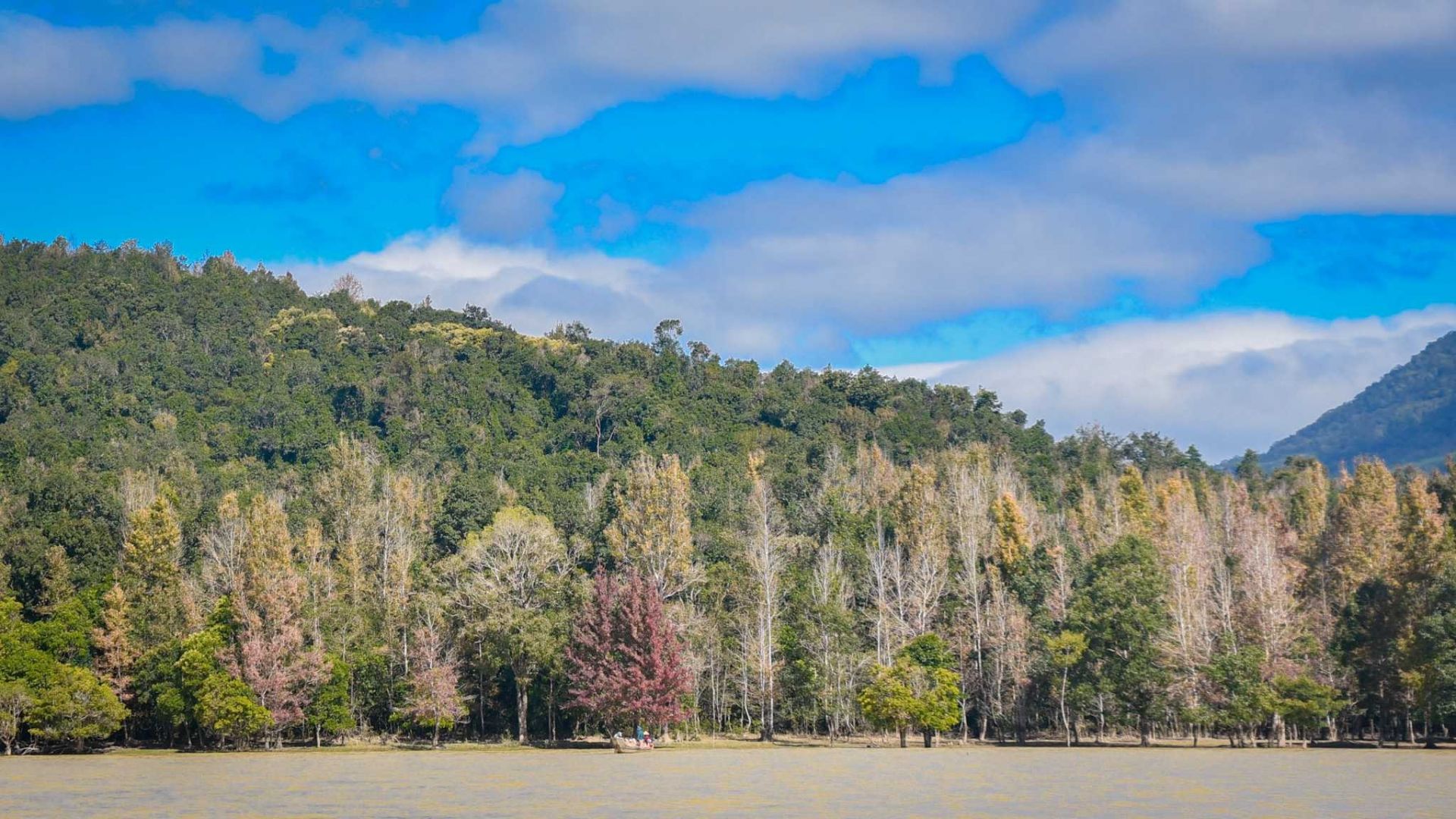 Tại khu vực Hướng Phùng, Hướng Hóa, những cánh rừng phong hương nằm xen kẽ giữa núi đồi và lòng hồ thủy điện Rào Quán tạo nên cảnh sắc đặc biệt. Nhìn từ trên cao, mặt nước xanh biếc phản chiếu sắc lá đỏ vàng, khiến khung cảnh trở nên mềm mại và giàu chiều sâu. Đây cũng là lý do nơi này ngày càng thu hút người yêu nhiếp ảnh và du lịch trải nghiệm.