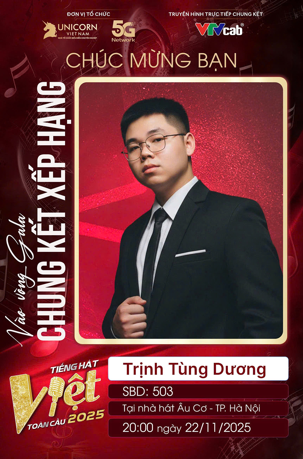 Ở lứa tuổi mà nhiều bạn bè đồng trang lứa vẫn loay hoay giữa giảng đường và những lựa chọn đầu tiên cho tương lai, Tùng Dương, nam sinh đến từ Hà Nam, đã tạo dấu ấn mạnh mẽ khi trở thành thí sinh trẻ nhất bước vào Chung kết xếp hạng Tiếng hát Việt Toàn cầu 2025. Không chỉ sở hữu chất giọng khỏe, giàu cảm xúc, Dương còn cuốn hút khán giả bởi sự tự tin và tinh thần thi đấu nghiêm túc qua từng vòng thi.