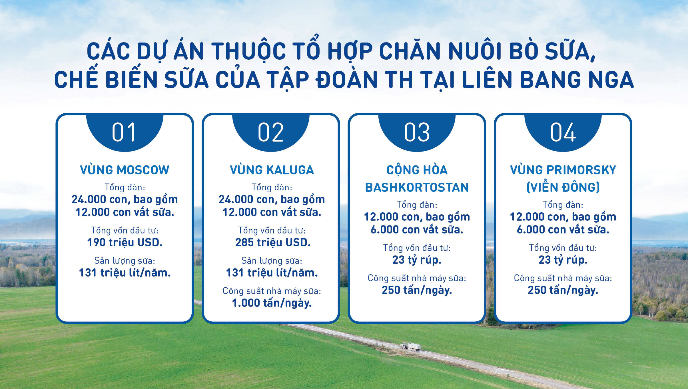 Ba trụ cột chính của chuỗi dự án TH tại Liên bang Nga hiện nay đều mang tầm vóc quốc gia. Tại tỉnh Kaluga, TH đã xây dựng tổ hợp trang trại bò sữa quy mô lớn kết hợp nhà máy chế biến sữa tươi sạch, ứng dụng công nghệ hiện đại của các nước tiên tiến như Đức, Thuỵ Điển, Israel… một trung tâm sản xuất sữa tươi hàng đầu của doanh nghiệp Việt Nam ở nước ngoài.