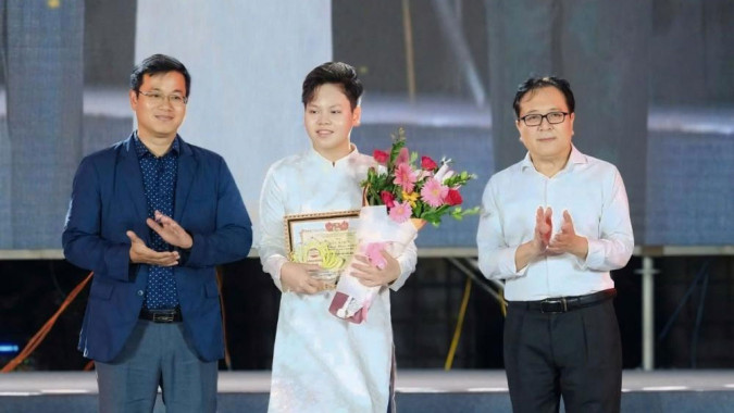 Bác Hoàng Văn Thức trao giải cho 2 bạn đoạt giải nhất. Ảnh: TP.