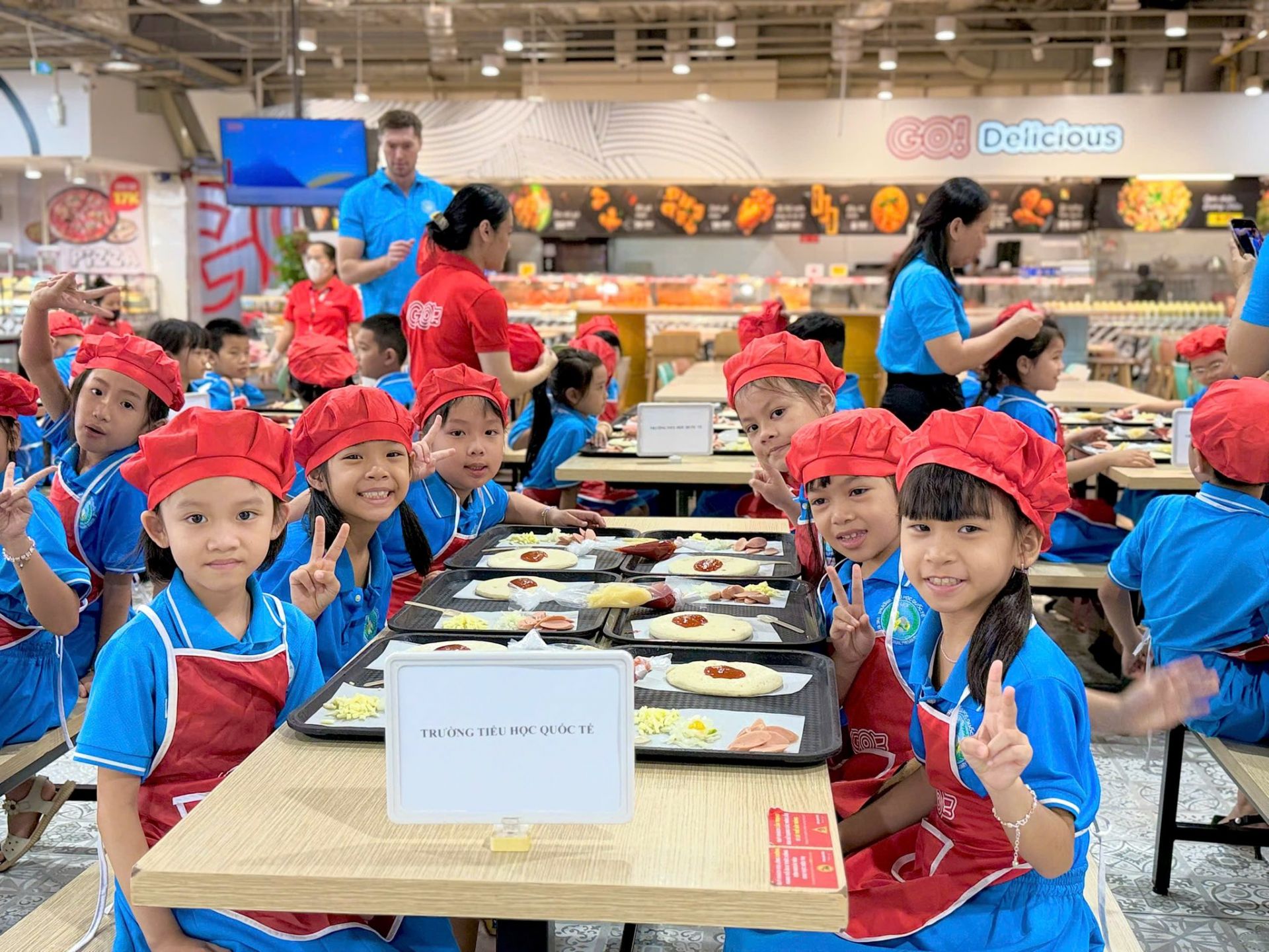 Một buổi học đặc biệt đã diễn ra khi hai lớp Song ngữ 2A1 và 3A1 rời khỏi phòng học quen thuộc để đến không gian rộng mở của một siêu thị gần trường. Tiết học “Cùng làm bánh pizza” tràn ngập tiếng cười, sắc màu và hương thơm ấm áp. Những “đầu bếp nhí” trong chiếc tạp dề xinh xắn, chiếc mũ trắng tinh say sưa phết sốt, rắc phô mai và hào hứng sáng tạo chiếc bánh của riêng mình.